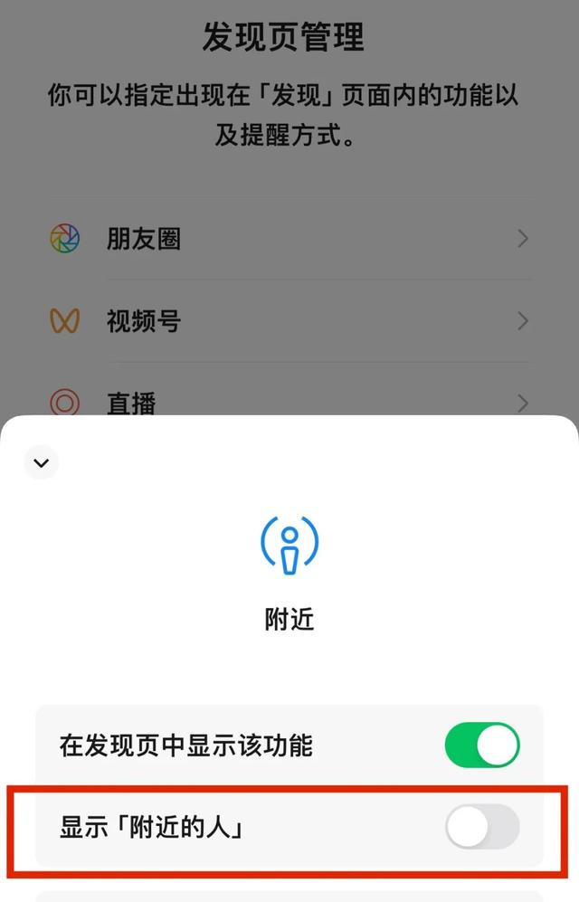 微信[设置]→[通用]→[发现页管理]→[附近]关闭该功能。