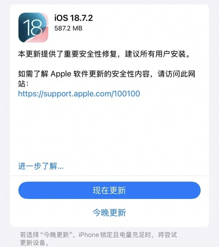 2025年11月5日,苹果向老机型推送了iOS18.7.2正式版,该系统版本号为22H124。本次更新苹果未明确说明更新内容,主要是以修复BUG、提升稳定性为主。